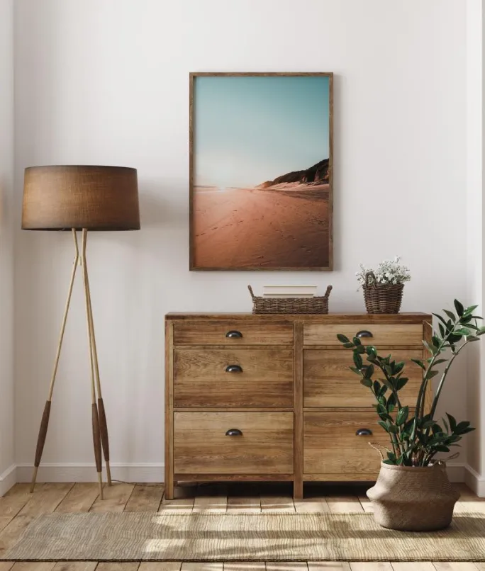 En landskabsplakat af en fantastisk strandstrækning med klitter og en blå himmel. Stranden strækker sig ud i det fjerne, hvor en lysende sol sidder i horisonten og tiltrækker øjet, mens den skinner på sandet. Forestil dig selv at lave disse fodspor i sandet, når du tager denne plakat med hjem.