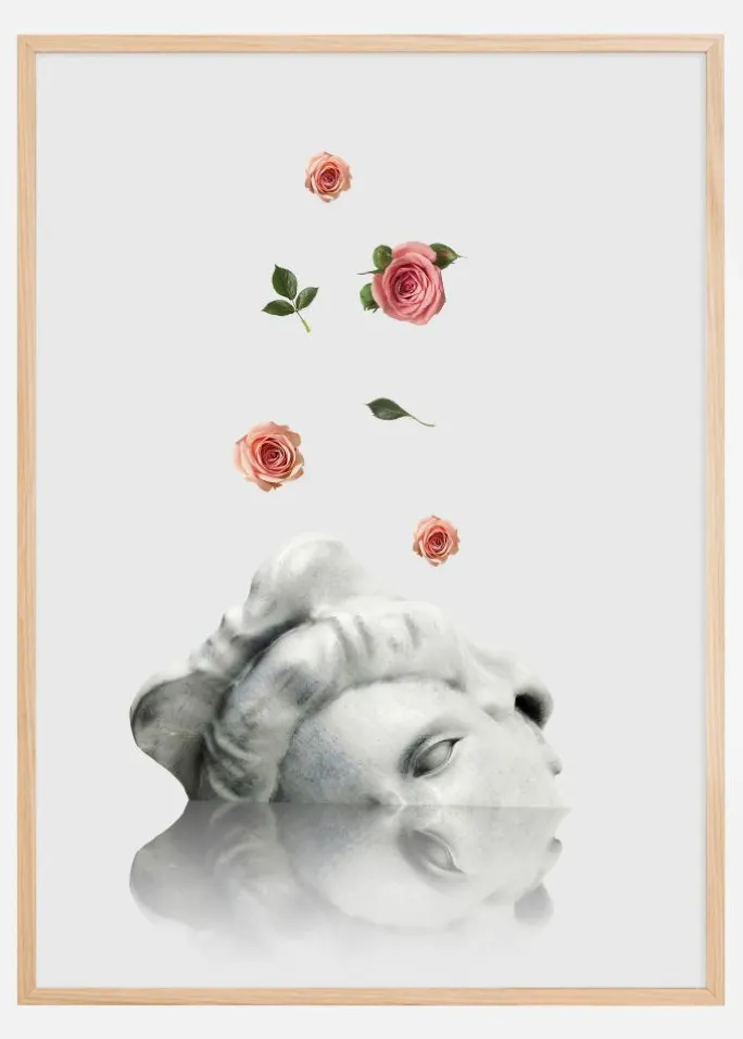 Denne kunstneriske plakat præsenterer en drømmelignende komposition, hvor en skulptur af et ansigt, der ser ud til at synke eller opløses, er omgivet af hvirvlende roser i forskellige stadier af blomstring og løv. Det er et fængslende billede, der forener skønheden i sten og flora, og tilbyder en følelse af både tidløshed og forgængelighed.