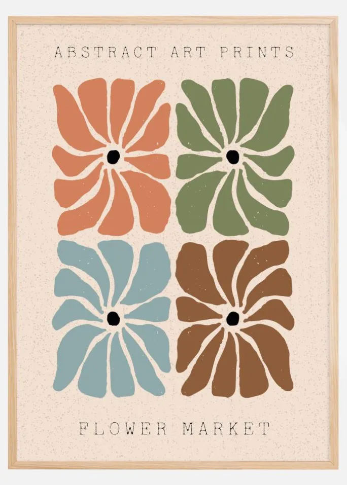 Denne livfulde plakat med abstrakt kunst fanger en følelse af legende og designbevidsthed gennem fire stiliserede blomster i en række af hyggelige farver. Hver blomst er udført i en anden nuance – fra terrakotta til skovgrøn, himmelblå og chokoladebrun – hvilket tilsammen skaber en farverig palet, der tilfører varme og personlighed til et rum. Teksterne “ABSTRACT ART PRINTS” og “FLOWER MARKET” forstærker kunstværkets moderne og kunstneriske udtryk og gør det til et perfekt indslag i et hjem, der vil hylde nutidig design og naturinspirerede elementer.