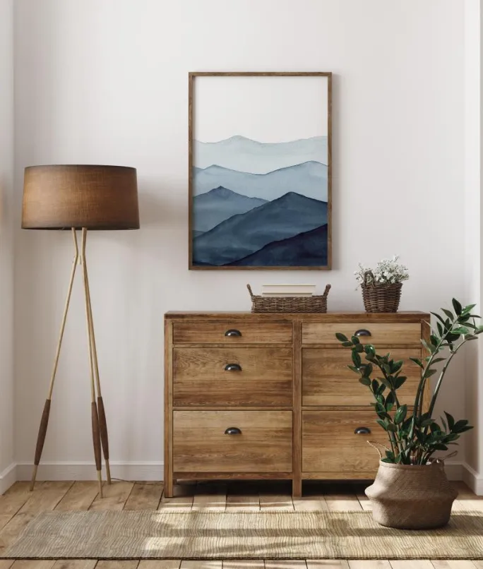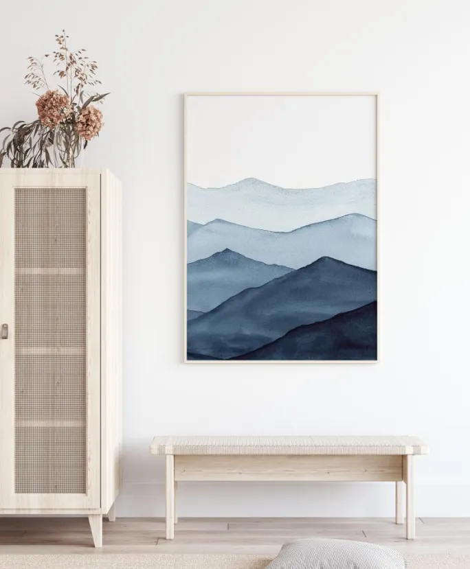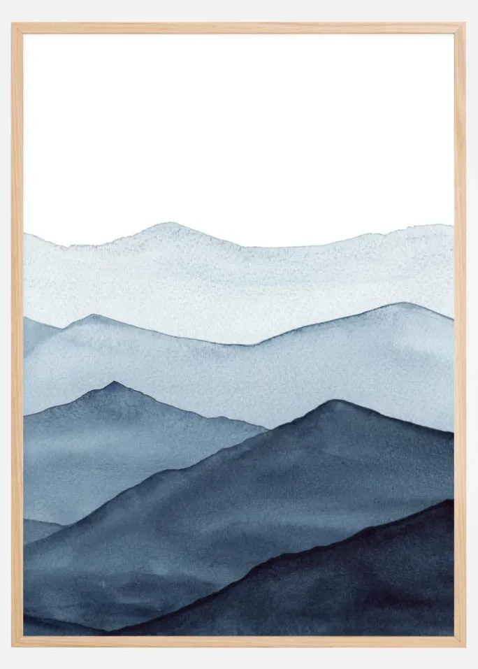 En fantastisk minimalistisk plakat af en række blå bjerge. Det nærmeste bjerg er en mørk blå nuance, og farverne bliver mere udvaskede, efterhånden som bjergene forsvinder i det fjerne. De bløde blå farver er perfekte til at skabe en kølig, men beroligende stemning, mens du stirrer ud i det fjerne.
