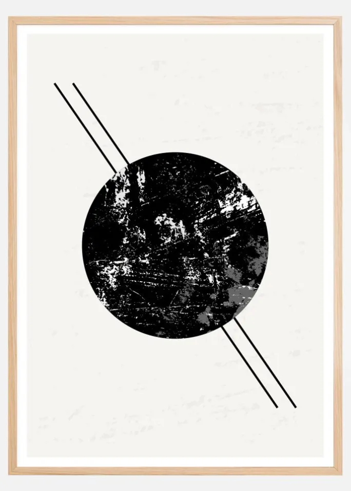 En stærk abstrakt plakat af en sort cirkel med to linjer, der løber fra øverst til venstre til nederst til højre. Den sorte cirkel har en hvid og grå marmor effekt, og de to sorte linjer skaber næsten Saturns ringe. Tag denne med hjem og se alle mulighederne i dette tankevækkende værk.