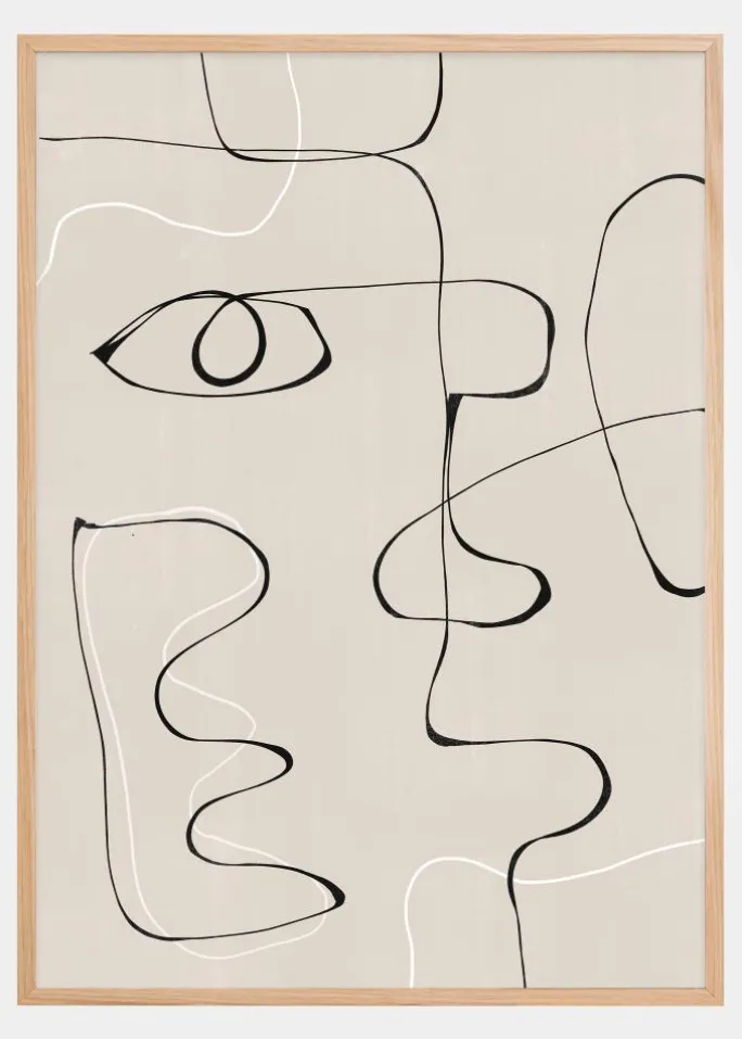 Printet, med dets enkle sorte linjer mod en cremehvid baggrund, er en fremragende repræsentation af moderne kunst, der fanger beskuerens fantasi. Denne plakat passer godt i et hjem eller kontor, hvor stilrent design og tankevækkende kunstværker er værdsat. Dets rene æstetik gør det til et alsidigt værk, der komplementerer en række forskellige indretningsstile.