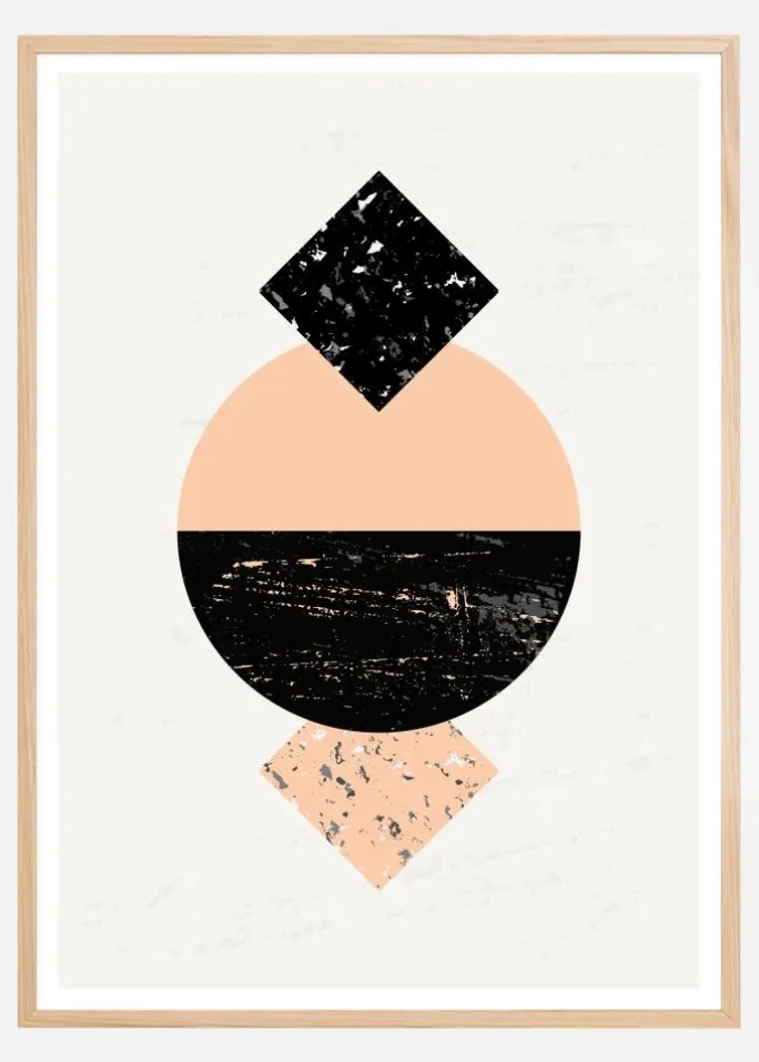 En kontrastgeometrisk plakat af abstrakte firkanter og cirkler. Den store cirkel i midten er opdelt i en ferskenfarvet øverste halvdel og en sort nederste halvdel, der ligner en by om natten. Som kontrast hviler en lyserød firkant mod den sorte, og en sort firkant sidder på den ferskenfarvede del af cirklen.