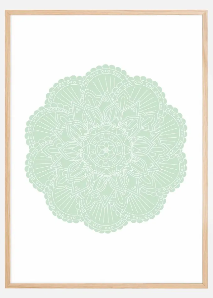 Denne plakat fremstiller en symmetrisk mandala i afslappende grønne nuancer, et billede der både er visuelt tiltalende og symbolsk rigt. Mandalaen, kendt for sin brug i meditation og afslapning, tilbyder et intrikat mønster der inviterer øjet til at udforske og sindet til at vandre. De bløde toner bidrager til en følelse af balance og harmoni, hvilket gør dette kunstværk til en perfekt indramning for kontemplation og ro.
