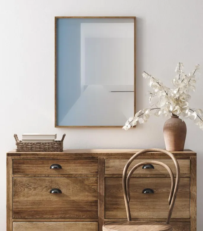 En indvendig abstrakt plakat med beroligende blå og hvide farver. Hovedbaggrunden er en blød blå med en hvid firkant, der ligner et vindue og en bordplade. Et udbrud af blødt hvidt til højre føles som solen, der bryder igennem for at skabe et stænk af ro i dit hjem.