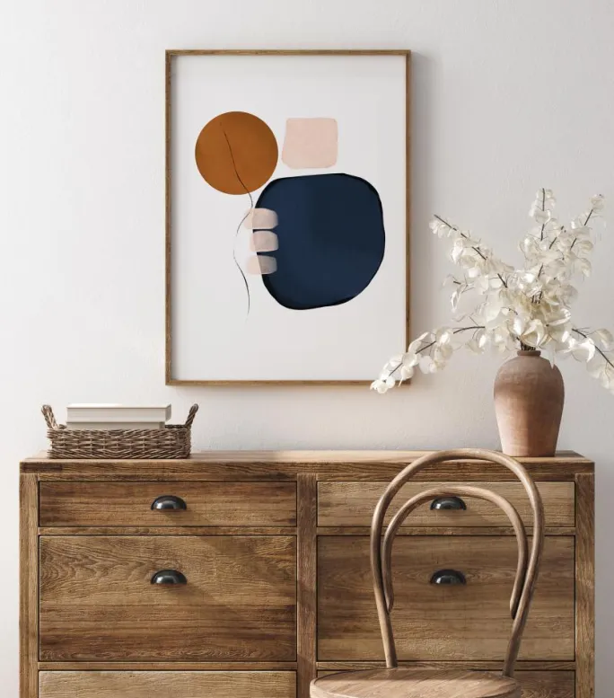 En enkel abstrakt plakat med en 3D-stil. Den store blå form trækker øjet til højre i billedet. De bløde pastelfarvede firkanter og et tyndt penselstrøg trækker øjet opad og leder øjet hen til den brune cirkel. Overvej dette billede, når du hænger det op i dit hjem.