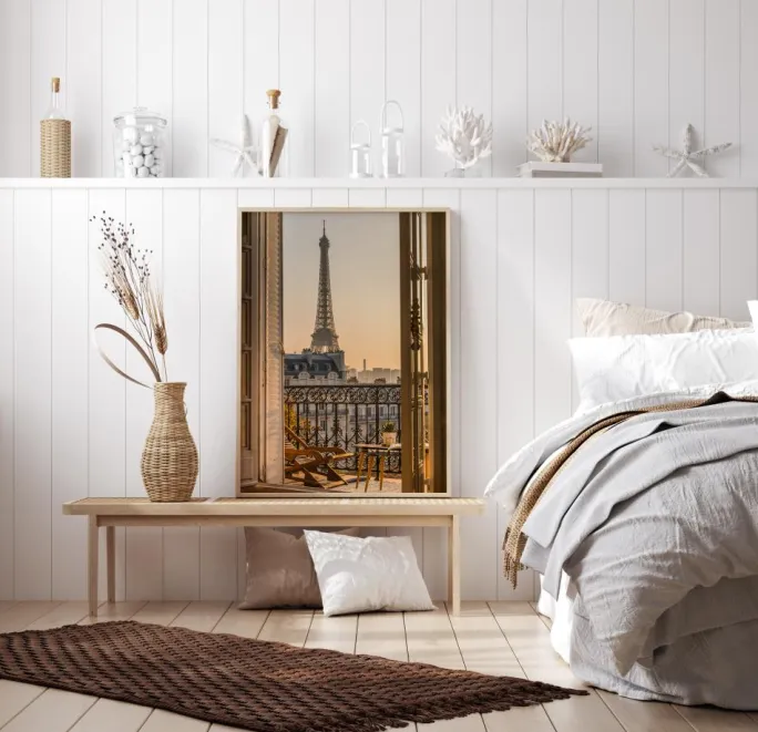 En smuk plakat med et bybillede, der viser Eiffeltårnet i det fjerne. En udsmykket balkon danner rammen om dette billede med et blødt morgenlys, der dækker stolen og gelænderet. Tårnet står højt og trækker øjet til sig. Man kan næsten mærke den kølige brise gennem de åbne døre.