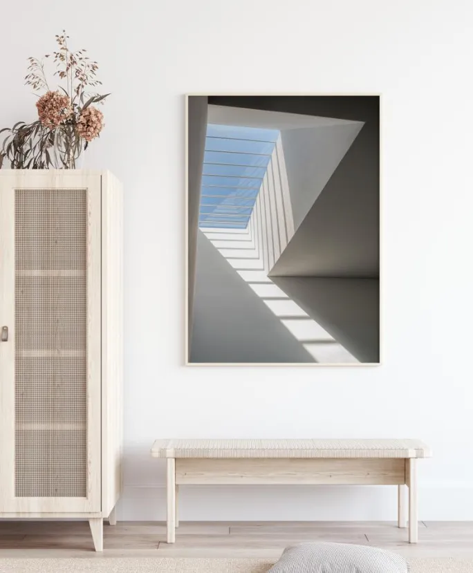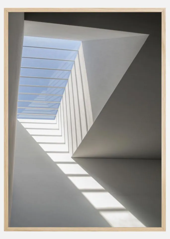 En enkel, luftig plakat i et lyst hvidt ruminteriør. Til venstre er der et tagvindue, hvor man kan se den blå himmel. Lyset, der strømmer igennem, kaster skygger, der ligner en stige, der leder øjet op til lyset udenfor. Tilføj lysstyrke til et mørkt rum med dette fredelige billede.