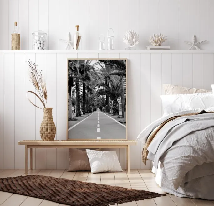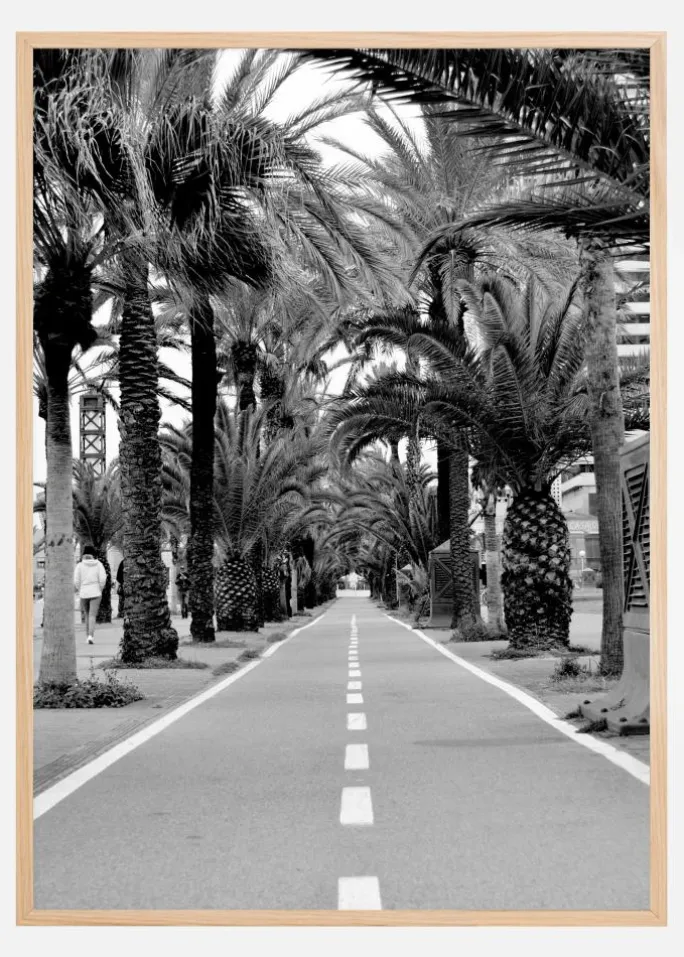 En landskabsplakat af en vejstrækning, der løber gennem en lund af palmetræer. Palmerne danner en kant til vejen, mens de hvide linjer fører dig ud i det fjerne. Træerne skaber en bue, der leder dine øjne hen. Sæt denne sort-hvide skønhed på din væg for at få en eksotisk stemning.