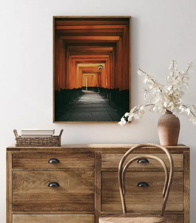 En brun geomatrisk plakat med en vej gennem en abstrakt tunnel. De mørkegrå sten på stien passer til de varme toner på trætaget, der lyser op i det fjerne. Sprækker af lys titter frem gennem træplankerne, og en lanterne hænger for at belyse vejen. Hæng denne op for at skabe en fredfyldt stemning.