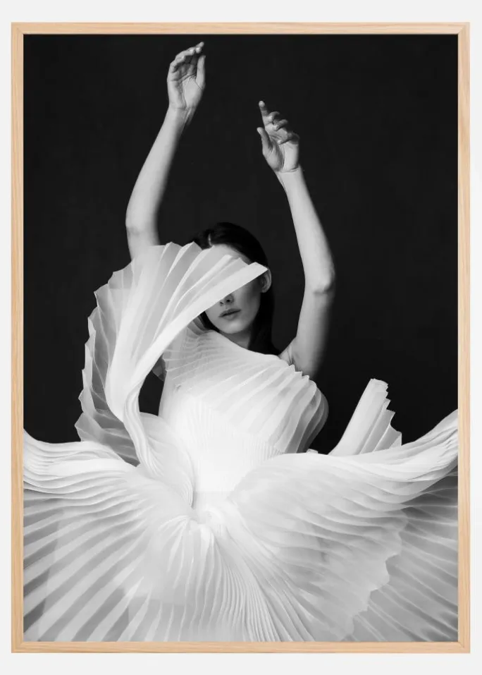 Denne fascinerende plakat er en hyldest til bevægelse og form, og fremstiller en dansers dynamiske skikkelse klædt i en hvirvlende, skulpturel dragt. Den sort-hvide kontrast i billedet forøger det dramatiske udtryk, hvor det hvide stofs strukturerede folder spiller mod baggrundens mørke. Danserens positurer og det ukendte ansigt efterlader plads til fortolkning og fascination, hvilket gør dette print til en kraftfuld, kunstnerisk erklæring i hvilket som helst rum.