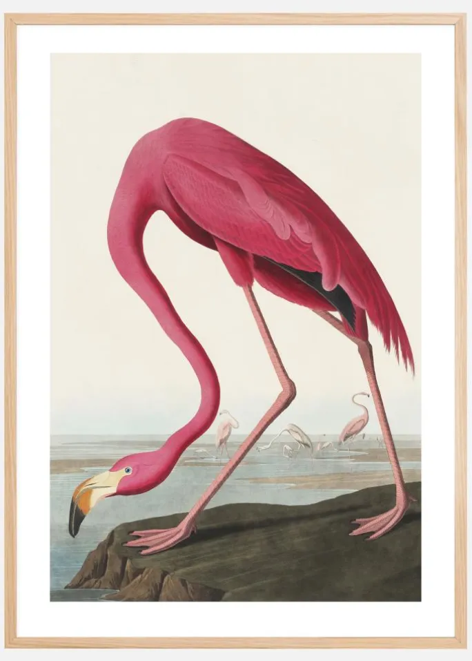 En naturplakat af en malet lyserød flamingo. Flamingoen er i centrum, og de lange ben fører op til den lyse krop og bøjer sig derefter ned for at følge halsen ned til søkanten. Mellem benene vader tre andre flamingoer i saltsøen i baggrunden for at skabe et kunstnerisk stykke kunst.