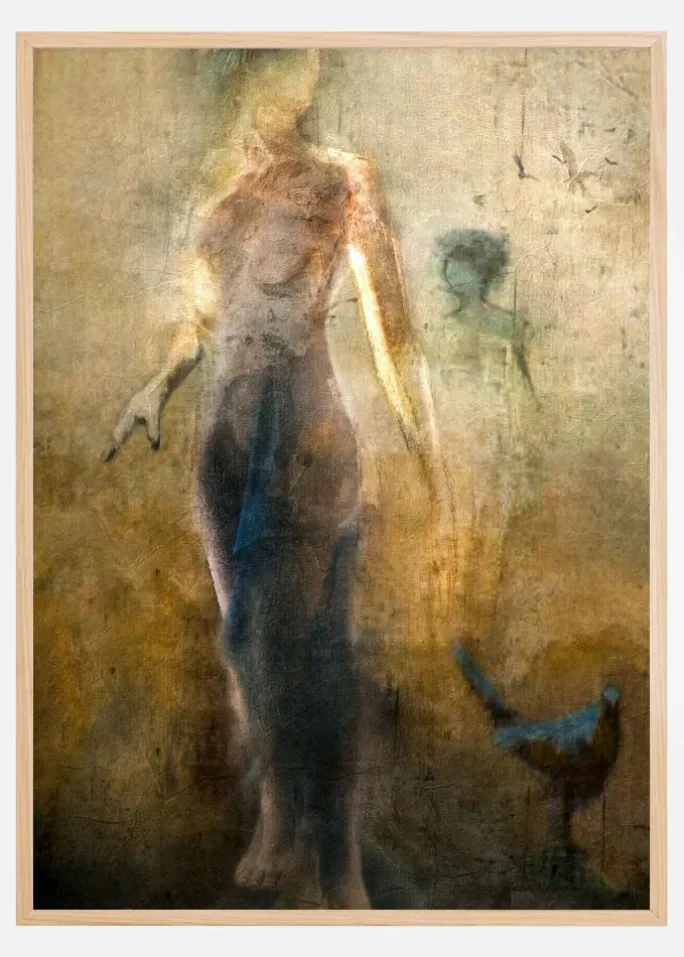 Fang blikket med denne mystiske og suggestive plakat, der synes at fortælle en historie ud over det visuelle. Motiv udforsker temaer af identitet og hukommelse gennem en skikkelse, der træder frem fra en grunge-inspireret baggrund. Det abstrakte element i kunstværket opstår gennem den diffuse, næsten spøgelsesagtige, fremtræden af figuren og de subtile antydninger af en silhuet i baggrunden, mens en ensom fugl synes at svæve frit.