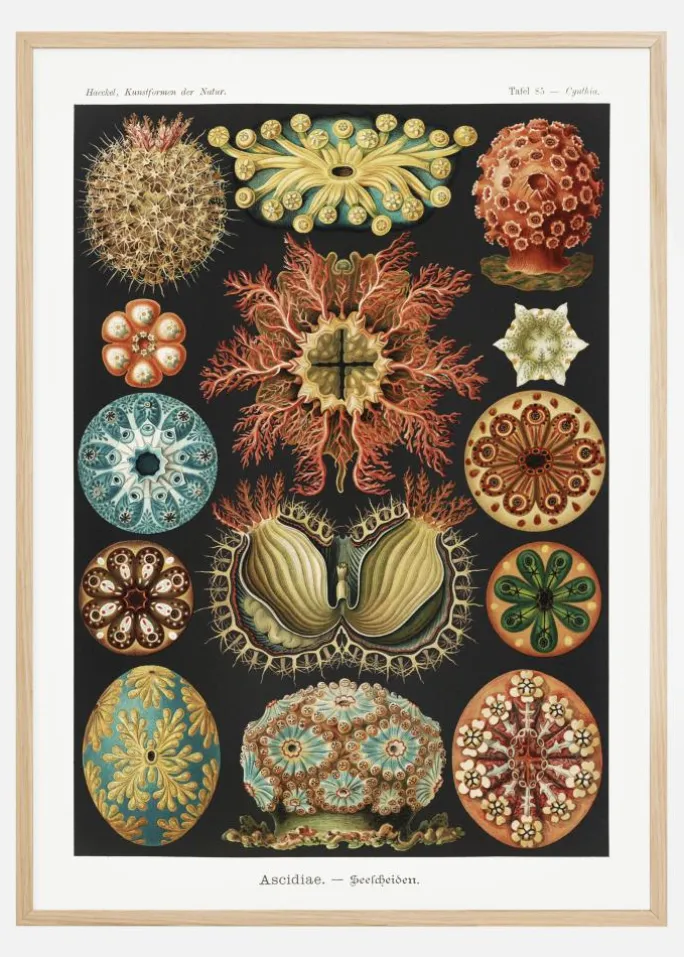 En zoologisk plakat fyldt med et mærkeligt animalium fundet på et museum. Denne lyse plakat viser en række vidunderlige skabninger fra havets dybder. Der vises udsnit af hver enkelt af dem, som viser deres mærkelige mønstre og designs for et abstrakt look. Gør denne plakat til et samtaleemne i ethvert rum.