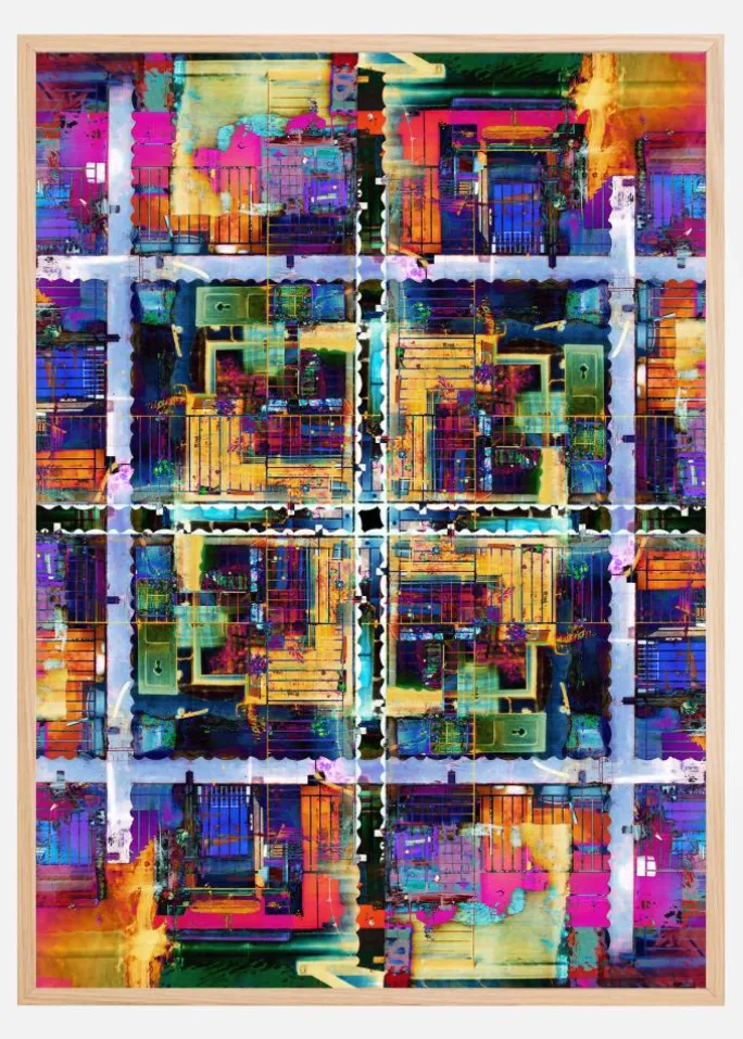 En neonplakat fuld af abstrakte mønstre. En regnbue af farver som en olieklat fylder dette billede, der ligner tværsnit af rum. Hver firkant er fyldt med et væld af farver, der gør dette til et fascinerende værk, som man kan stirre på i timevis – bedst sammen med en neutral væg.