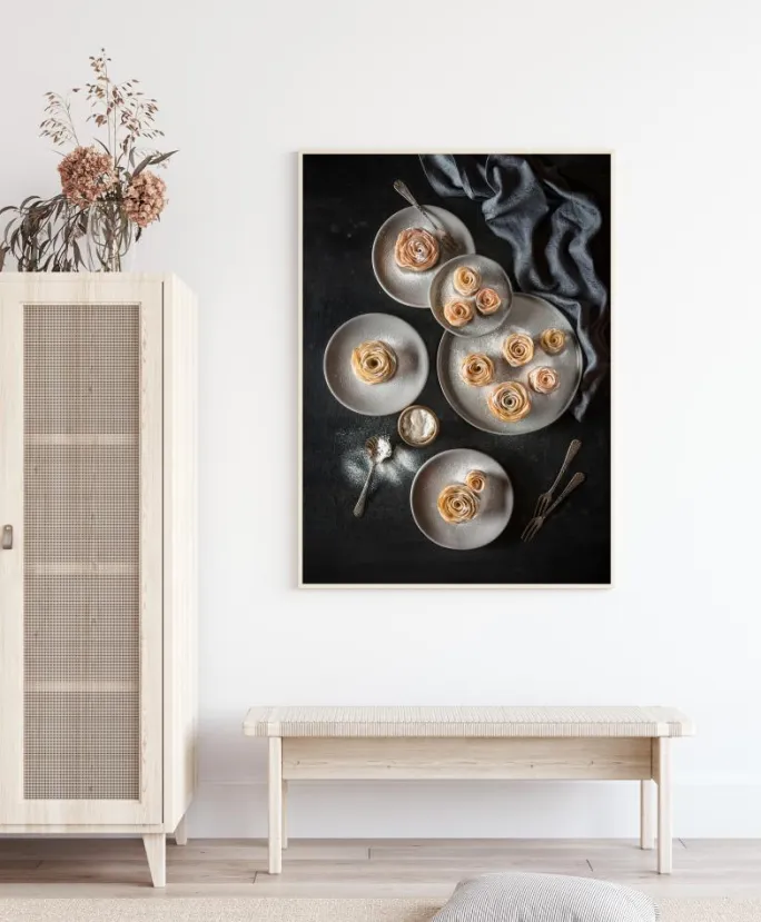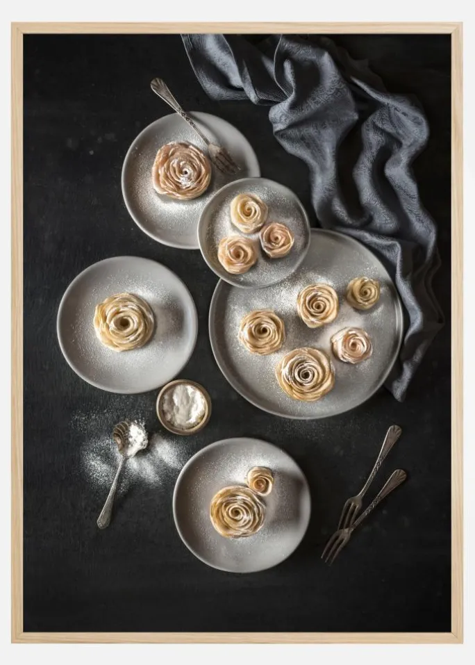 En simpel middagsplakat komplet med bakker med forskellige søde kager. disse æbletærter er utroligt delikate, hver enkelt er overtrukket med sukker og formet som en skrøbelig rose. De hvide tallerkener og de gyldne, sprøde kager skiller sig ud mod den sorte dug. Du vil føle dig klar til noget sødt med dette derhjemme.
