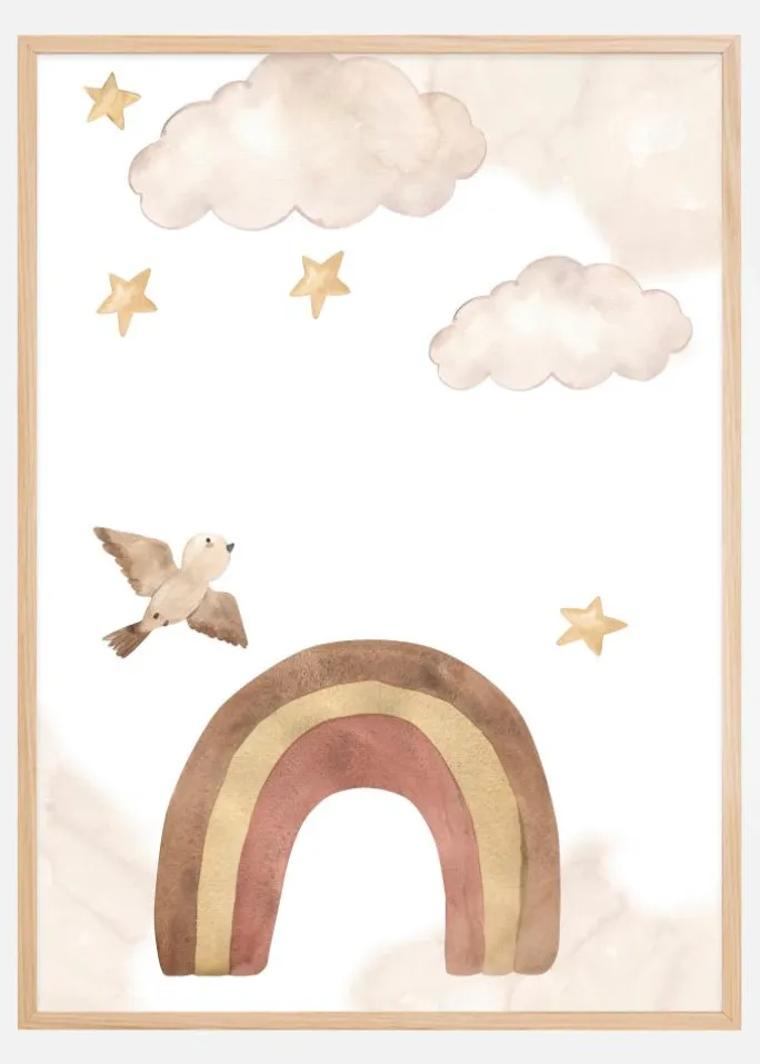 Den akvarelteknik, der bruges til at skabe regnbuen og skyerne, giver en følelse af lethed og transparens, mens fuglens detaljer tilføjer bevægelse til billedet. De jordnære toner i regnbuen giver et moderne twist til det klassiske motiv og gør denne plakat til et elegant tilføjelse i et rum med naturlige eller neutrale farver. Uanset om det er for at blødgøre en voksens arbejdsmiljø eller for at stimulere børnenes fantasi, er dette kunstværk en smuk og alsidig indretningsdetalje.