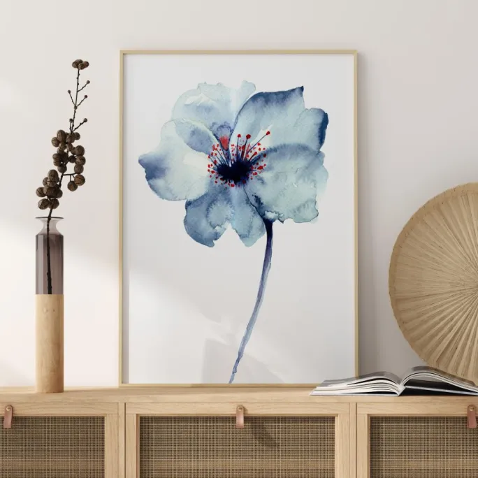 En storslået blomst malet i blå og rød akvarel. En smuk plakat i al sin enkelthed, som passer lige så godt i køkkenet eller entreen som i stuen eller soveværelset.