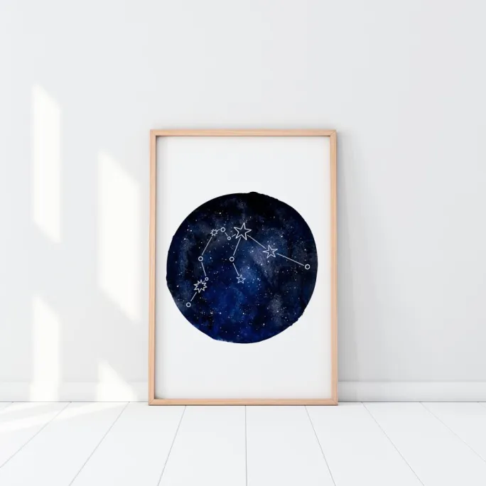 En abstrakt plakat af stjernetegnet Vandmanden. En ophængt mørkeblå globus indeholder et billede af galaksen og skitserer stjernetegnet. Kloden er placeret på en enkel hvid baggrund. Sæt den på en hvilken som helst væg derhjemme, så du kan se stjernetegnet på nattehimlen.