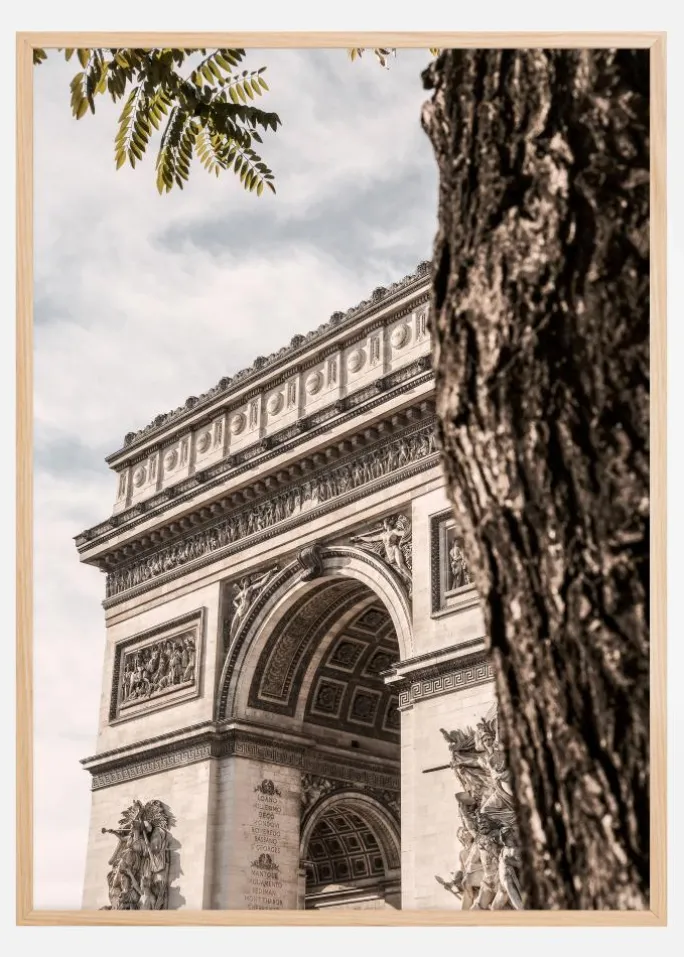 Denne plakat er ikke blot en afbildning af en historisk bygning, men også en kunstnerisk fortolkning, der fanger kontrasten mellem det urbane landskab og naturen. Den detaljerede struktur på Triumfbuen, fra dens indviklede reliefs og skulpturer til de storslåede søjler, står i harmoni med den ru bark på træet i forgrunden. Dette motiv tilbyder en afbalanceret komposition af teksturer og farver, hvilket skaber en atmosfære, der er både indbydende og inspirerende. Det er den ideelle plakat for den, der værdsætter arkitektur, historie og design.