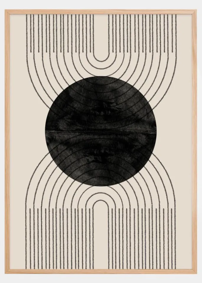 Denne æstetisk tiltalende plakat kombinerer struktur med spontanitet, hvor en særpræget sort kugle er centreret blandt rytmiske buer, der følger en ordnet sekvens. Den sorte sfære skaber en illusion af dybde og rum, og giver et stærkt fokus i designet, mens de bløde linjer skaber en arkitektonisk harmoni. Det er en hyldest til kontrasten mellem det ordnede og det organiske, mellem præcision og frihed.