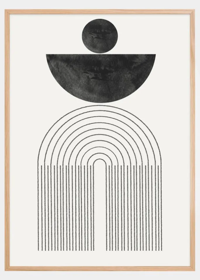 Denne dristige og suggestive plakat er en stilren fortolkning af månens cyklusser og himmellegemernes harmoni. Den sorte halvcirkel og den fulde cirkel ovenover illustrerer månens forskellige faser, mens de svævende linjer nedenfor ligner arkitektoniske søjler eller portaler til en anden dimension. Kunstværkets sort-hvide kontrast giver en følelse af elegance og mystik, der beriger ethvert rum.