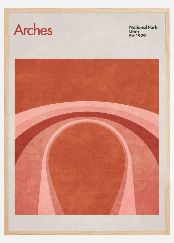 Denne minimalistiske og nutidige plakat hylder Arches National Park i Utah med sin stiliserede repræsentation af parkens berømte geologiske formationer. Den koncentriske bueform, der er i centrum af designet, er en abstraktion af de naturlige buer, der udgør parkens unikke landskab, fanget her på en ren og visuelt tiltalende måde.