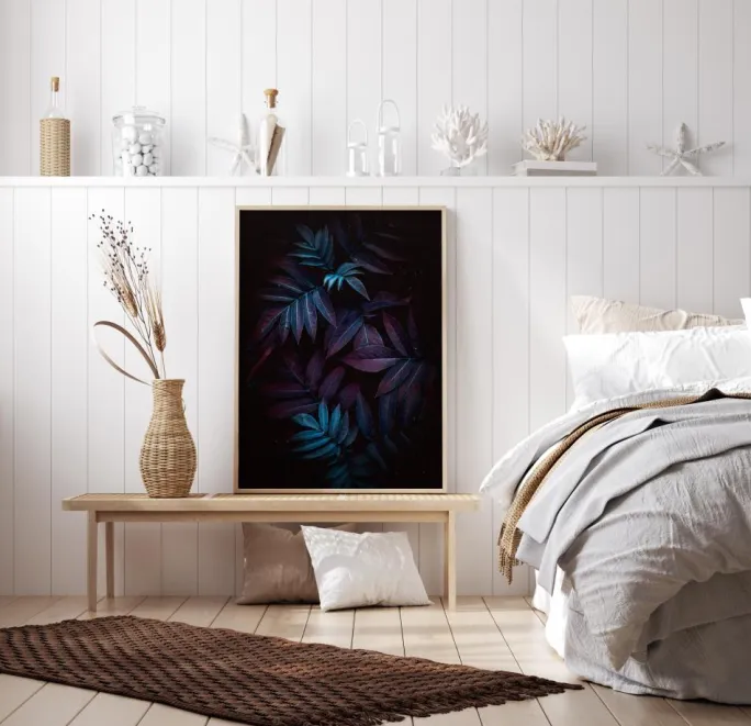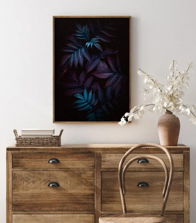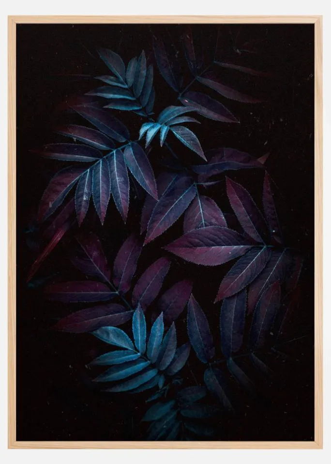 En naturplakat med blå og lilla blade i en mørk ramme. De lyseblå højdepunkter på nogle af bladene får dette stykke til at springe frem og giver det en æterisk fornemmelse, når bladene kommer frem fra mørket. Sæt denne plakat på en lys væg for at opnå den bedste effekt derhjemme.