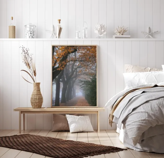 En dramatisk naturplakat af en sti forbi høje modne træer. Til venstre når tykke træstammer og orange blade op til himlen. Til højre står grønne nåletræer i kontrast til de røde løvtræer. Tåge udgår fra afstanden og skaber en køligere fornemmelse, der bringer naturens storhed ind i dit hjem.