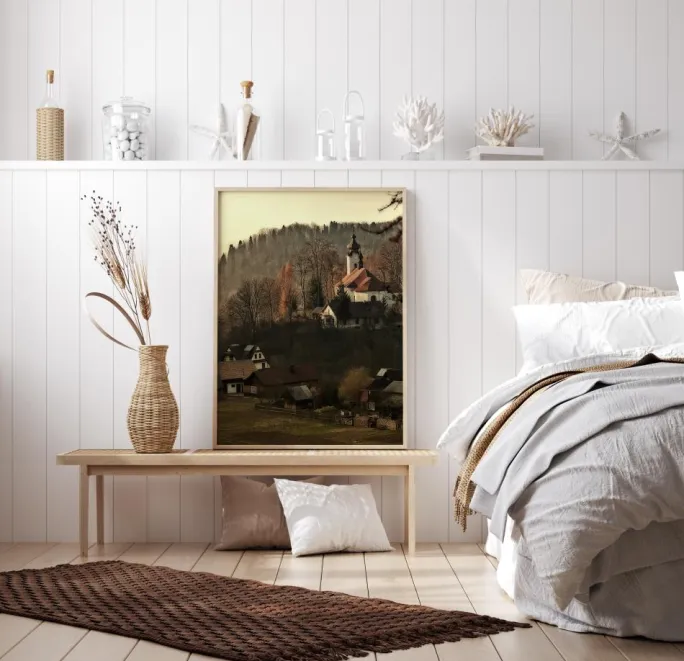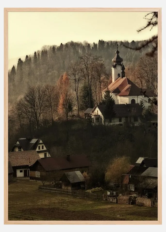En plakat med et bybillede af en lille landsby med gamle huse og marker med træklædte bakker bagved. Et hvidt kirketårn står højt mod landskabets dæmpede brune og grønne farver. Fordyb dig selv og din fantasi i denne maleriske landsby, når du sætter denne plakat op på din væg.