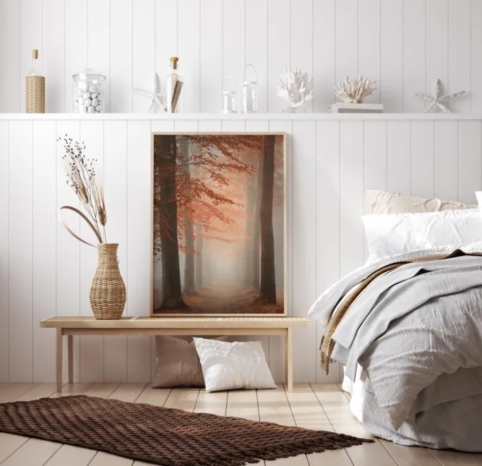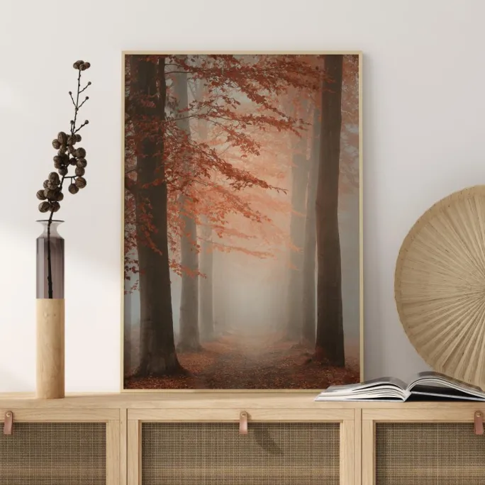 En landskabsplakat med høje træer, røde blade og en tåget destination. Træstammerne skaber en naturlig grænse, som du kan følge i det fjerne. Den hvide tåge lokker dig gennem stien, mens rørbladene giver en varm, blid og blødere tone i denne efterårsagtige og æteriske plakat.