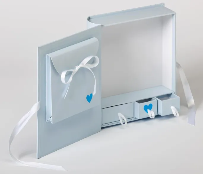Gaveboksen har en praktisk størrelse som passer perfekt på bogreolen derhjemme. Boksens inderside er forsynet med 3 små skuffer samt en kuvert, så du let kan opbevare små ting. Mindeæsken lukkes ved at binde en sløjfe med båndende.