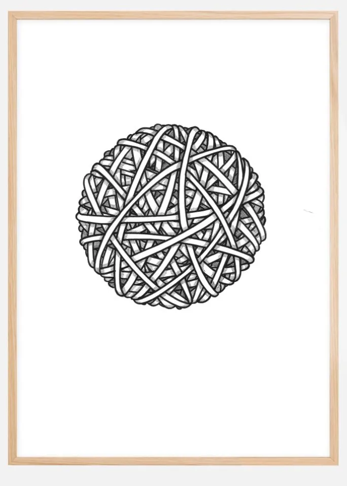En grafisk plakat i sort og hvid af et garnnøgle formet som en bold. En enkel og minimalistisk billede, der passer fremragende til at blande med andre skønne favoritter i et større collage.