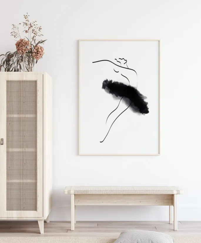 En akvarel af en ballerina i tynde sorte linjer med en mere udtalt sort ballerinakjole. En minimalistisk og stilren plakat som passer lige så godt i soveværelset eller entreen, som i stuen eller på biblioteket.