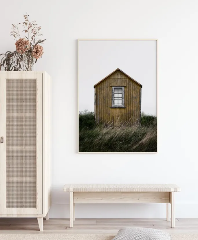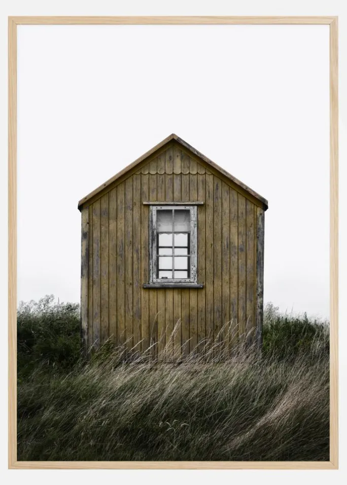 En elegant landskabsplakat med en enkelt træstrandhytte. Den ensomme hytte står på vindblæste klitter og græs. Mærk åbenheden og friheden, når du tilføjer billedet til dit hjem.