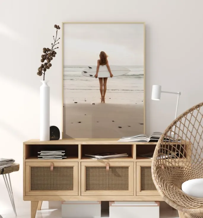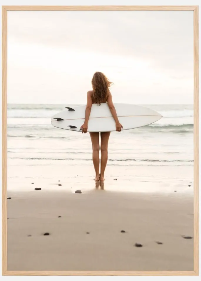 Et dejligt fotografi af en kvinde på stranden, der holder en surfbræt bag ryggen, mens hun skuer ud over horisonten. En rigtig feel good plakat med bløde toner og former. Passer til de fleste hjem og indretningsstile.