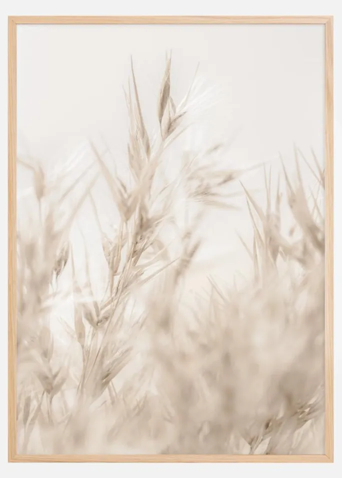 Denne smukt komponerede plakat fremkalder følelsen af en sommereng i hvile, med dens tørrede planter, der fanger en stille skønhed. Motivet skildrer tørrede strå og aks i varierende længder, hvor hver detalje og hvert frøstand kommer til sin ret. De beige og neutrale toner skaber en atmosfære af ro og giver en varm og naturlig præg til indretningen.