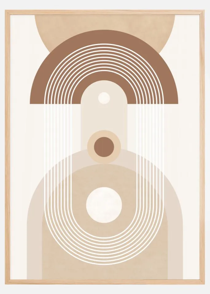 Denne sofistikerede og stilrene plakat fortsætter vores kuraterede samling af mid-century modern kunst. Den abstrakte komposition, som leger med både form og negativt rum, bruger et begrænset farvespektrum af beige og brune toner for at skabe en følelse af dybde og bevægelse. Med dens geometriske figurer og overlappende linjer tilbyder denne plakat en subtil kompleksitet, der kan værdsættes fra alle vinkler.