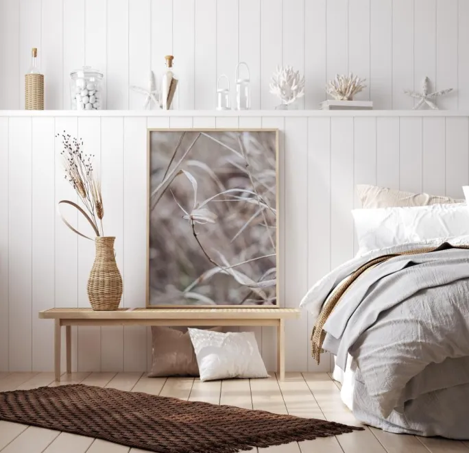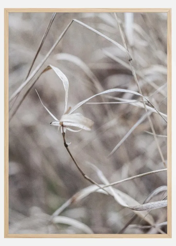 En elegant naturplakat med bløde blade i nærbillede. De bløde stilke og blade leder øjet rundt om værket. Den ufokuserede baggrund giver en fornemmelse af dybde. Sæt denne plakat på en lys væg i blokfarve for at få de bløde neutrale pasteller til at stå frem.