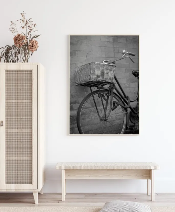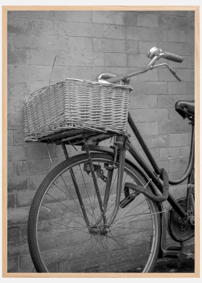 En stillebenplakat af en cykel, der læner sig op ad en murstensvæg. Cyklens kurv af flet er i fokus, mens den læner sig op ad væggen. Den stærke sorte ramme og cykellåsen leder øjet rundt på plakaten. Tilføj dette enkle stykke elegance til en lys væg for et smagfuldt look.