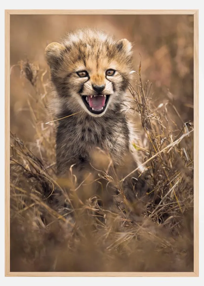 Denne charmerende plakat fanger essensen af glæde og legesyghed med et billede af en ung gepardunge, der smiler bredt. Omgivet af det gyldne græs i sit naturlige habitat, stråler dens levende øjne og udtryksfulde ansigt af nysgerrighed og livsglæde. Det skarpe fokus på ungen mod den slørede baggrund fremhæver dens smukke pels og de legesyge detaljer i dens udtryk.
