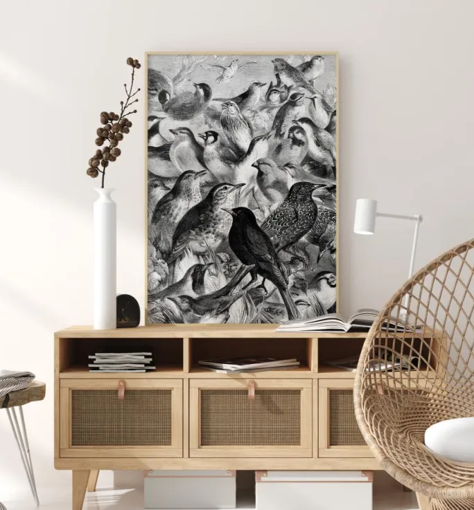 En sort/hvid plakat med forskellige fugle. Lær alt om fugle i dette billede i printstil med forskellige britiske fugle. Hold dig selv beskæftiget, mens du opdager fuglene på billedet og lærer om dem. Få dem til at skille sig endnu mere ud på en farvestrålende væg derhjemme.