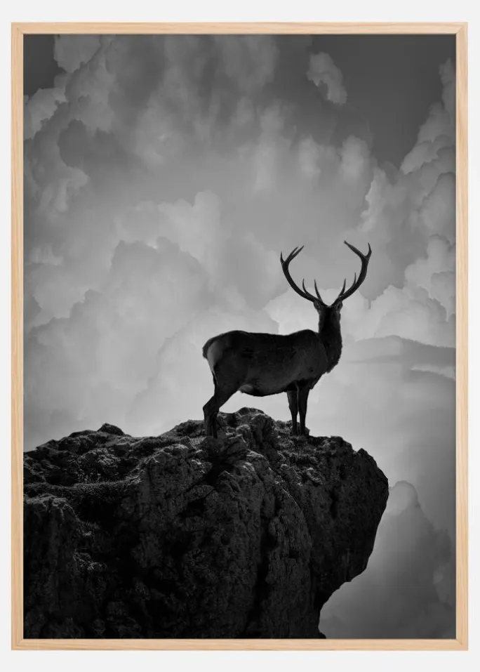 Med en monokrom farvepalet, der fremhæver de dristige konturer af hjortens skikkelse og de subtile detaljer i dens omgivelser, tilbyder denne plakat en stilren og moderne touch til enhver indretning. Skyernes tekstur tilfører et blødt og dynamisk element, der balancerer den robuste klippeformation. Dette kunstværk, indrammet og klar til at tage sin plads på en væg, indbyder til refleksion og beundring, en tidløs hyldest til vildmarkens og dyrelivets uforklarlige skønhed.