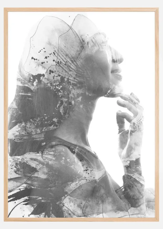 Denne kunstneriske plakat viser et dobbelteksponeringsbillede af en kvinde i profil, hvis form smelter sammen med abstrakte blækstænk og akvarelmønstre i en sort-hvid palette. Billedet er en fængslende fusion af menneske og kunst, der fanger skønheden i kvindelig eftertanke og kreativitetens flygtige natur. Dette kunstværk ville være et dristigt og tankevækkende supplement i enhver moderne indretning.