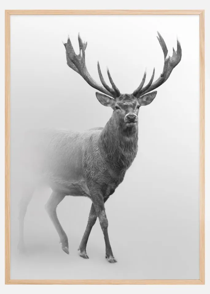 Billedet præsenterer dyret med en blød tåge omkring, hvilket skaber en drømmelignende effekt og tillader hjorten at stå i centrum. Nuancerne af gråt og hvidt i denne print fremhæver hver detalje, fra de grove konturer af hornene til de fine linjer i pelsen, og giver en følelse af ro og stilhed. Denne plakat er perfekt for dem, der ønsker at indrette deres hjem med naturinspirerede elementer, der appellerer til både kunstelskeren og naturelskeren.