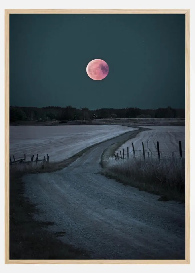 En fantastisk plakat af et snedækket landskab med en knaldrød blodmåne i midten. En vej bevæger sig ind i det fjerne og trækker øjet lige hen til månen, der hænger lavt på himlen. De grå og blå farver skiller sig ud mod månens røde og lyserøde farve og skaber en følelse af ærefrygt i dette natlige billede.