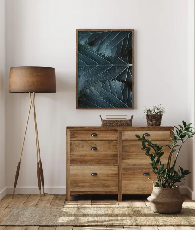 En botanisk fotokunst plakat, der fremstiller bagsiden af smukke blågrønne blade, hvor bladenes årer danner dejlige mønstre og linjer i billedet. Et motiv, der gør sig fremragende i et større collage af favoritter.