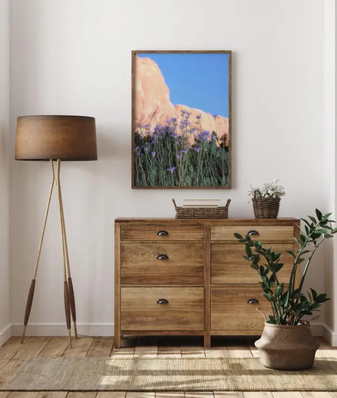 En blændende naturplakat med lilla blomster, klippebjerge og en stærk blå himmel. De lilla kornblomster er i fokus, der rækker op mod himlen og sætter de orange klipper og den store, vidtstrakte himmel i relief. Fortab dig i naturen, når du tager dette print med hjem og hænger det op i dit soveværelse.