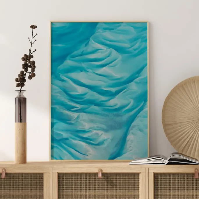 En flimrende plakat med blå bølger. Dette abstrakte maleri er skabt af en række let flydende penselstrøg over hele billedet, der leder øjet op og rundt for at skabe en beroligende effekt. Bring dette beroligende værk ind i dit hjem for at skabe elegance på badeværelset.