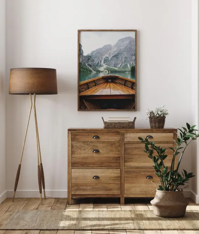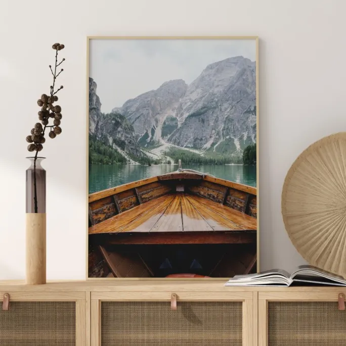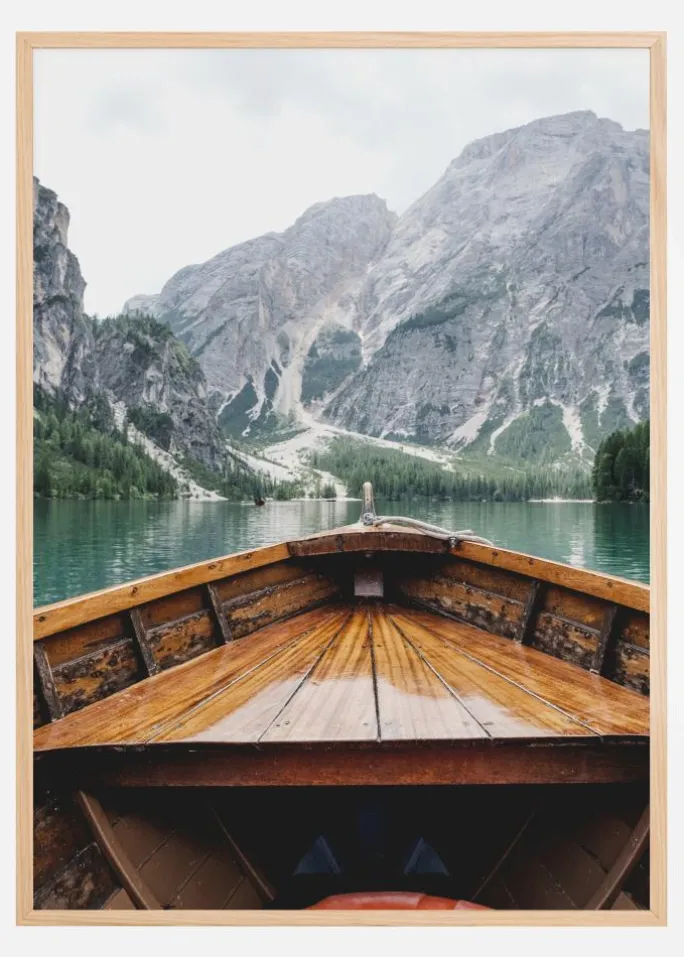 En naturskøn plakat, der viser bjergudsigten fra en træbåds komfort. Bådens bov fører øjet hen over vandet til de grå, træklædte bjerge og den overskyede himmel. Forestil dig, at du er i båden, når du står foran dette værk derhjemme.